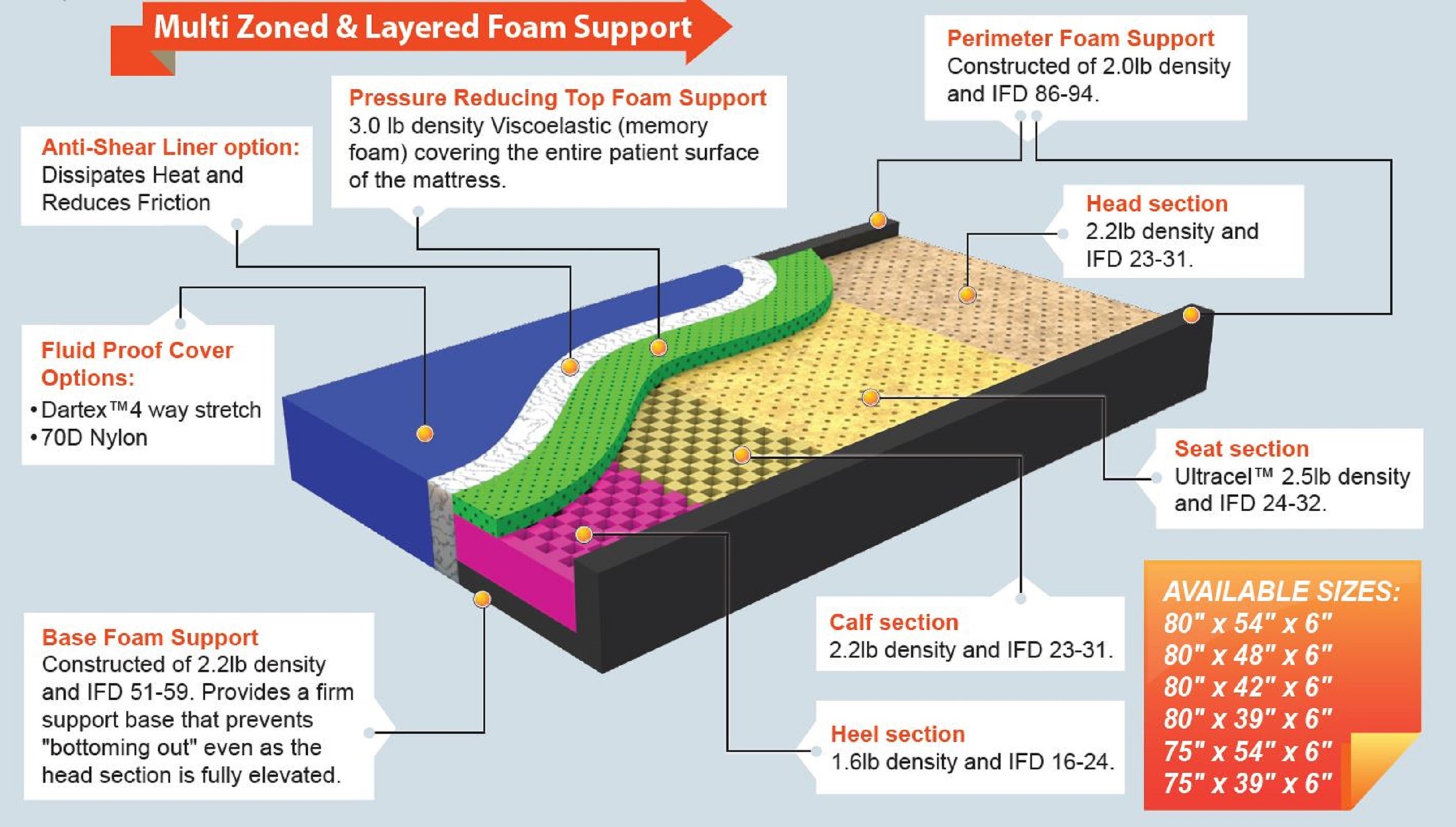 Comfort, Safety and Durability is directly addressed with the: 3 Layer, 4 Zone design, 100% medical grade fabric and green friendly foam; Firm internal foam side rails and Optional Anti-shear Liner.