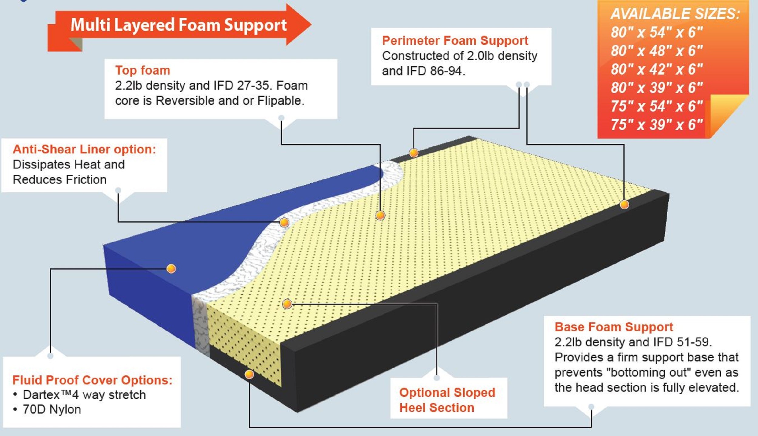Comfort, Safety and Durability is directly addressed with the: 2 Layer, 1 Zone design, 100% medical grade fabric and green friendly foam; Firm internal foam side rails and Optional Anti-shear Liner.