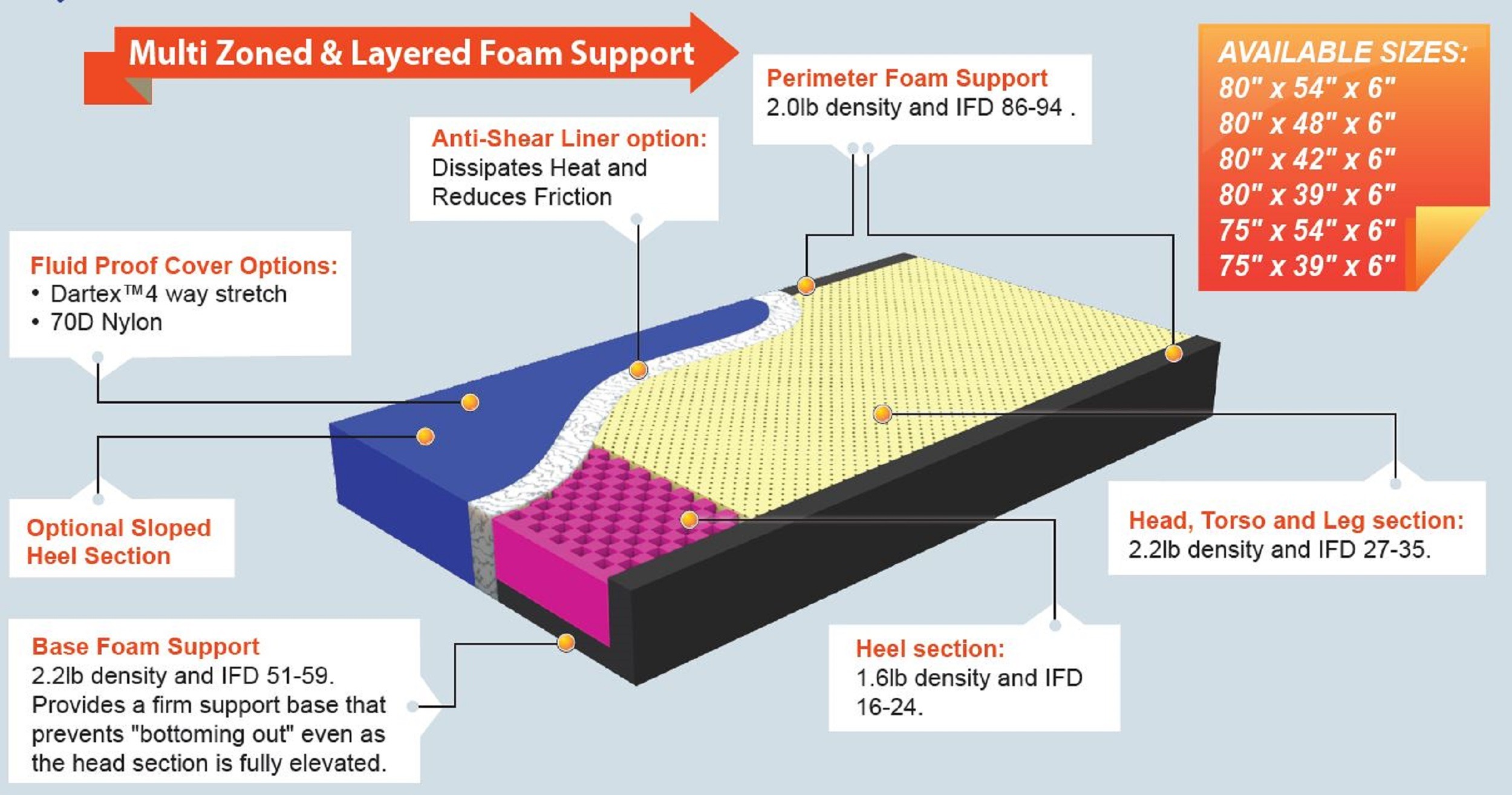 Comfort, Safety and Durability is directly addressed with the: 2 Layer, 2 Zone design, 100% medical grade fabric and green friendly foam; Firm internal foam side rails and Optional Anti-shear Liner.